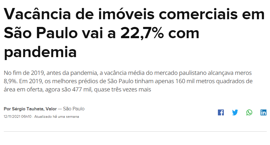 A pandemia funcionou como uma espécie de máquina do tempo de crises e levou o mercado imobiliário comercial de São Paulo de volta a cinco anos atrás. Segundo pesquisa da Canuma Capital, o segmento de escritórios da capital paulista apresenta uma vacância média de 22,7% no terceiro trimestre de 2021, índice visto pela última vez no período de 2016, quando o país passava por uma das piores recessões da história.